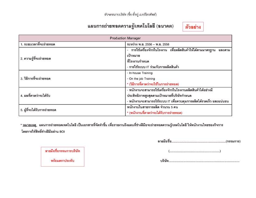 - การยื่นขออนุมัติตำแหน่ง หากไม่ใช่ตำแหน่งที่เป็นกรรมการมีอำนาจลงนาม บริษัทจะต้องแนบ "แผนการถ่ายทอดเทคโนโลยี" ทุกตำแหน่ง ตามเงื่อนไขทั่วไปของบัตรส่งเสริม